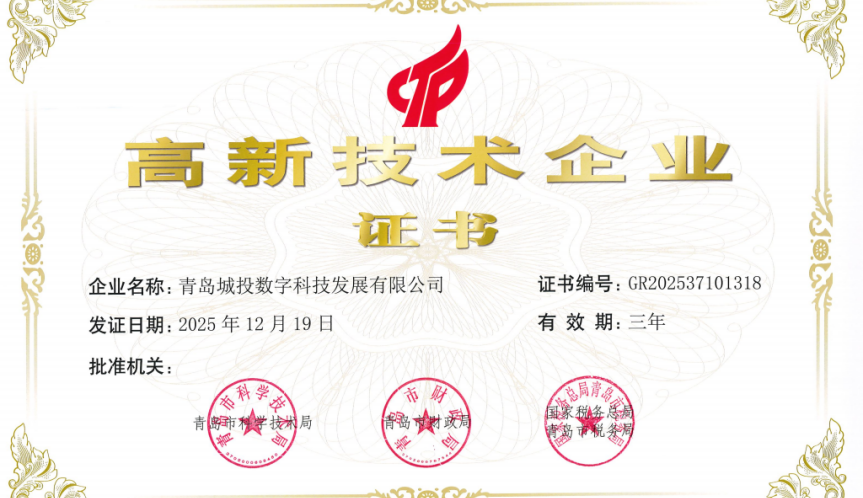 • 青島城投數科公司獲得市“高新技術企業”認定